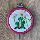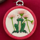'Daisy Frog' is a delightfully happy piece of embroidery, featuring a cute frog sitting on a rock, surrounded by daisies. With their pink and white petals standing out from the fabric, the daisies add a little bit of depth and texture. Above the frog, a tiny bee is buzzing busily amongst the flowers. Stitched on 'antique white' cashel linen, this is a really fresh and happy embroidery.