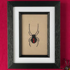A framed embroidery art work featuring a Black Widow spider! The design is stitched with black thread and a vibrant red for the spider's markings. The back of the spider is stitched with black metallic thread which glistens in the light. The light sand-coloured fabric background intensifies the dramatic colouring of the spider.