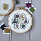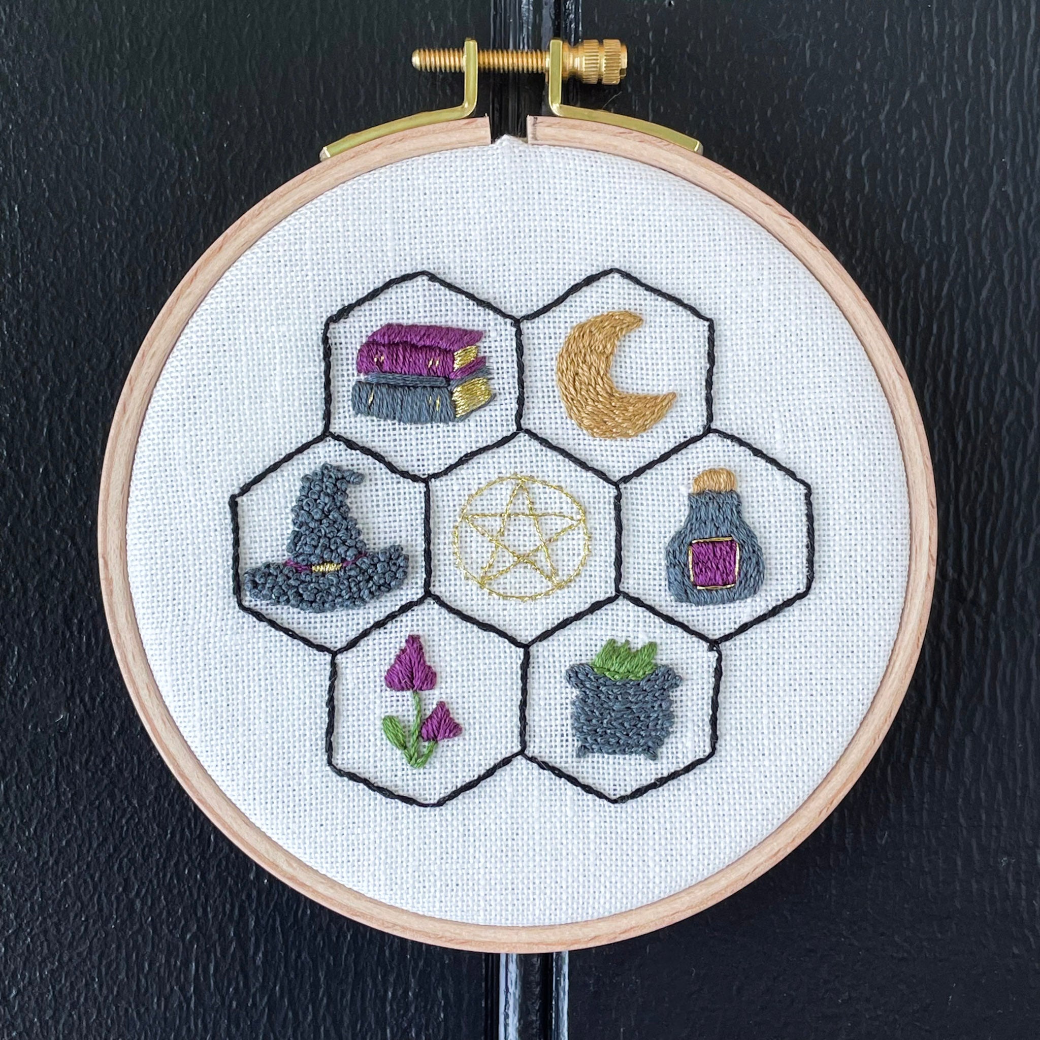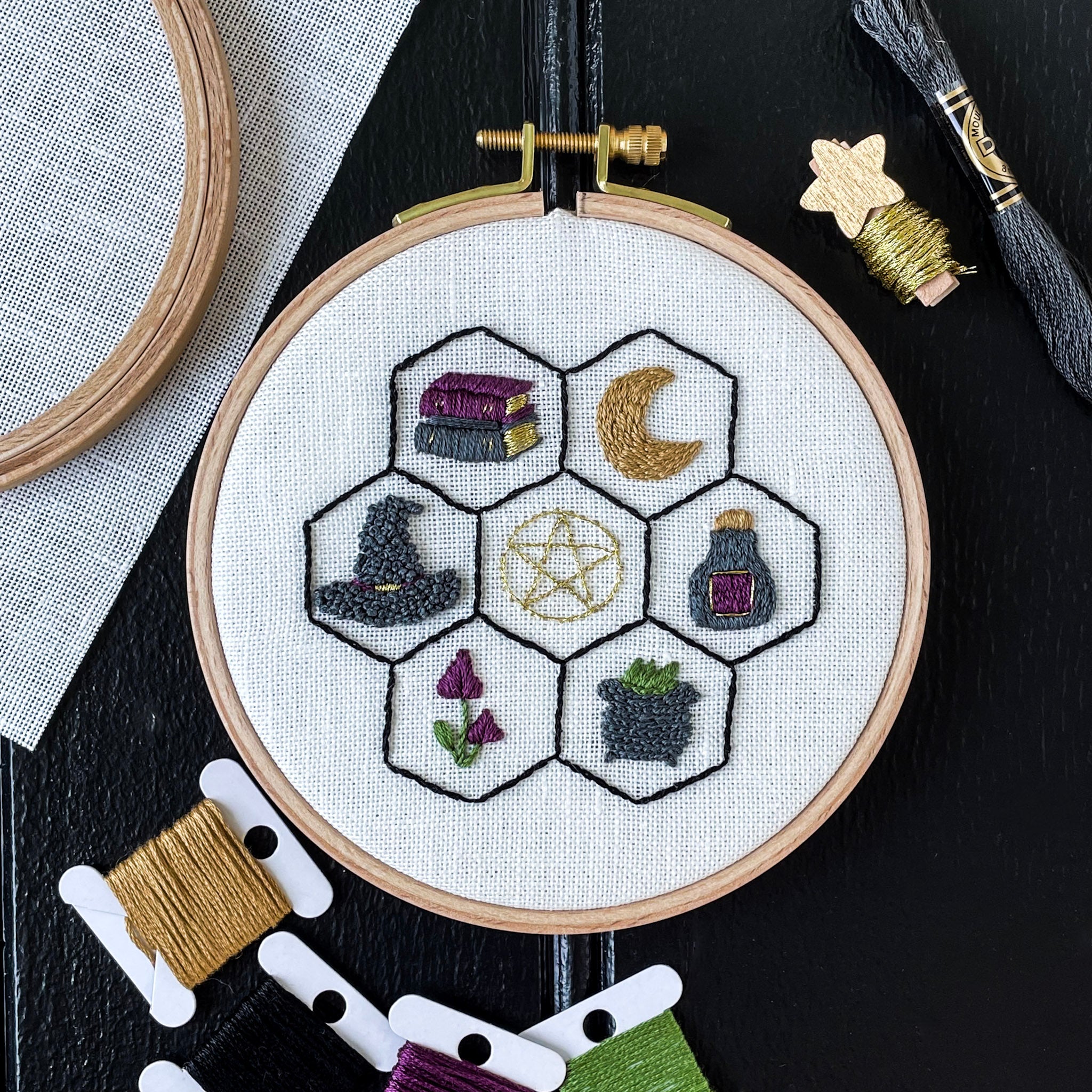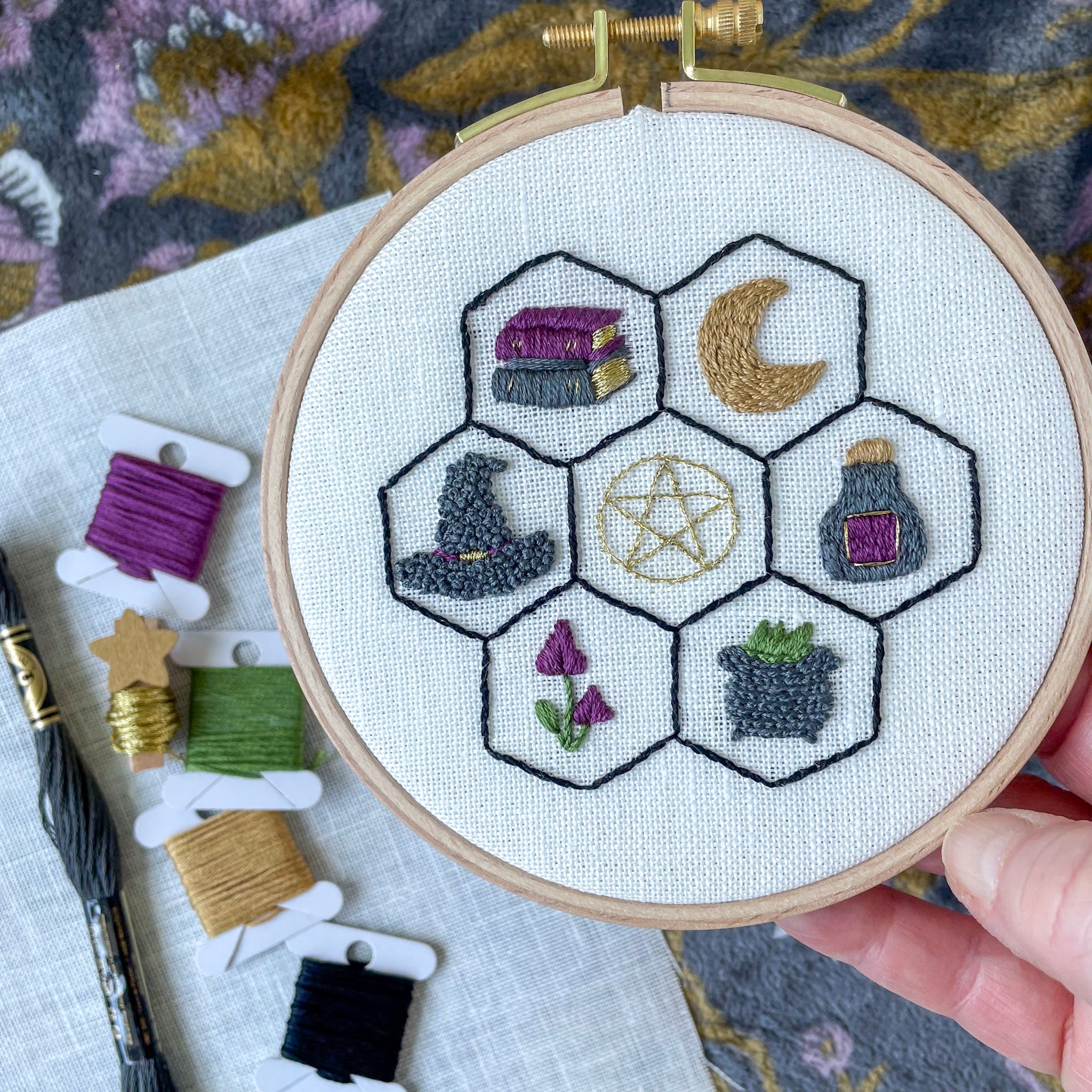 The Honeycomb Hex embroidery kit combines witchy motifs with the beautiful geometry of the honeycomb. Each cell holds a magical motif — books, crescent moon, potion bottle, cauldron, plant, and witch’s hat — all surrounding a golden pentacle.