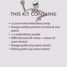 The kit includes everything you need: a hoop, needle, and thread. With an easy-to-follow design outline that you stick onto the item and stitch through, along with step-by-step colour instructions, the process is simple and enjoyable.