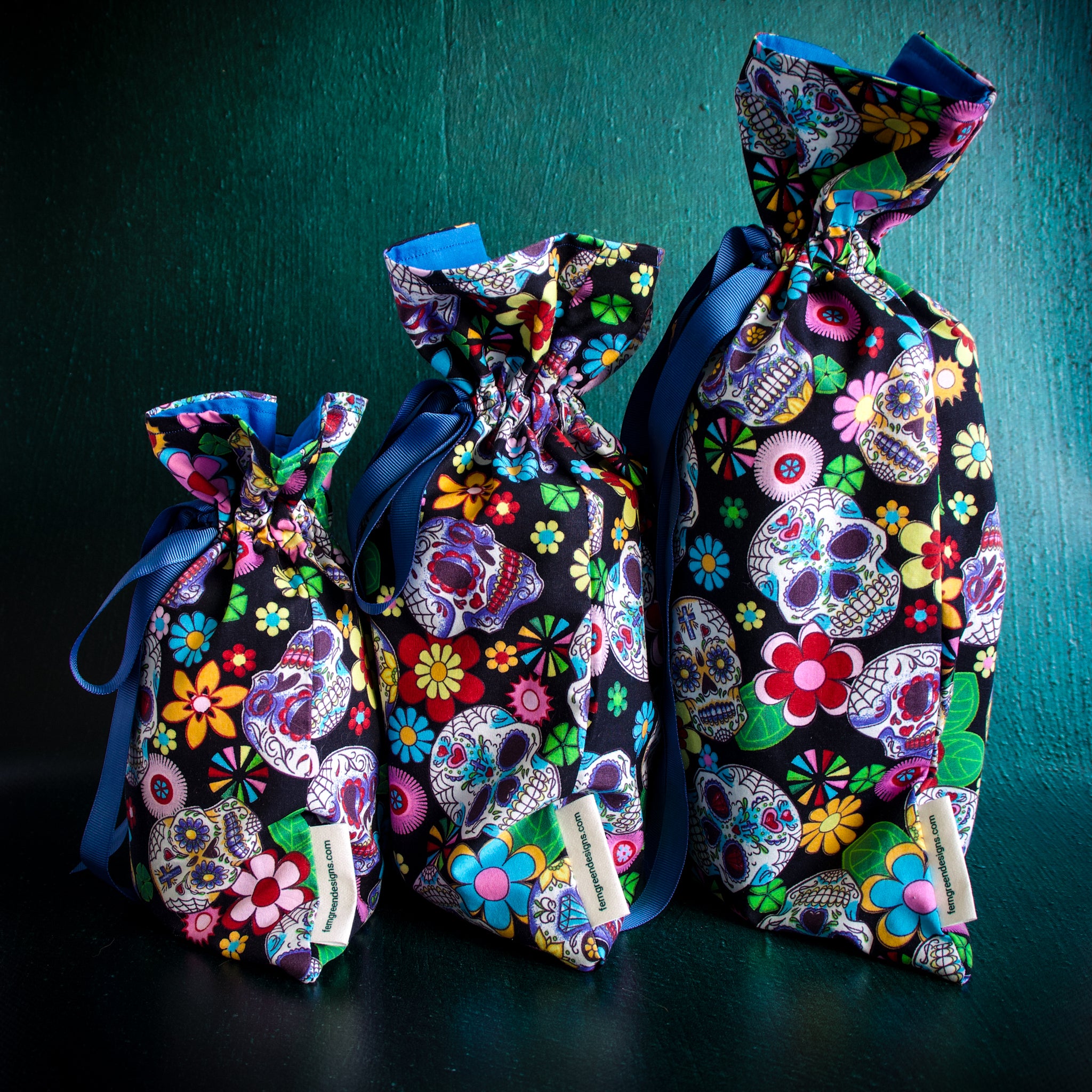 These sugar skull fabric bags have been made from fabric leftover from other craft projects.