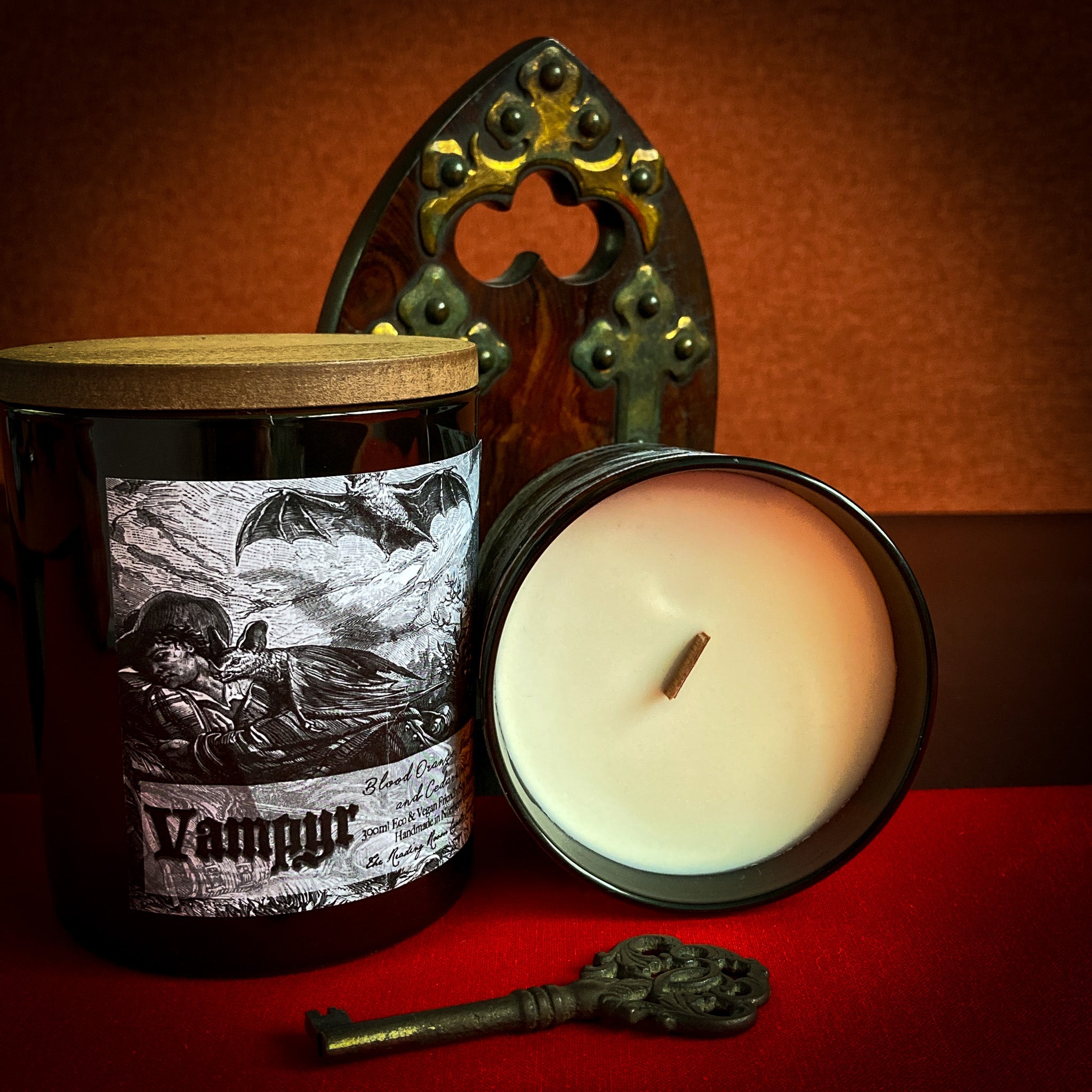 Step into the world of Gothic tales with Vampyr, inspired by Bram Stoker's Dracula. This candle's fragrance opens with the bright zest of blood orange, verbena and lemon, blending into a rich floral rose and finishing with cedarwood.