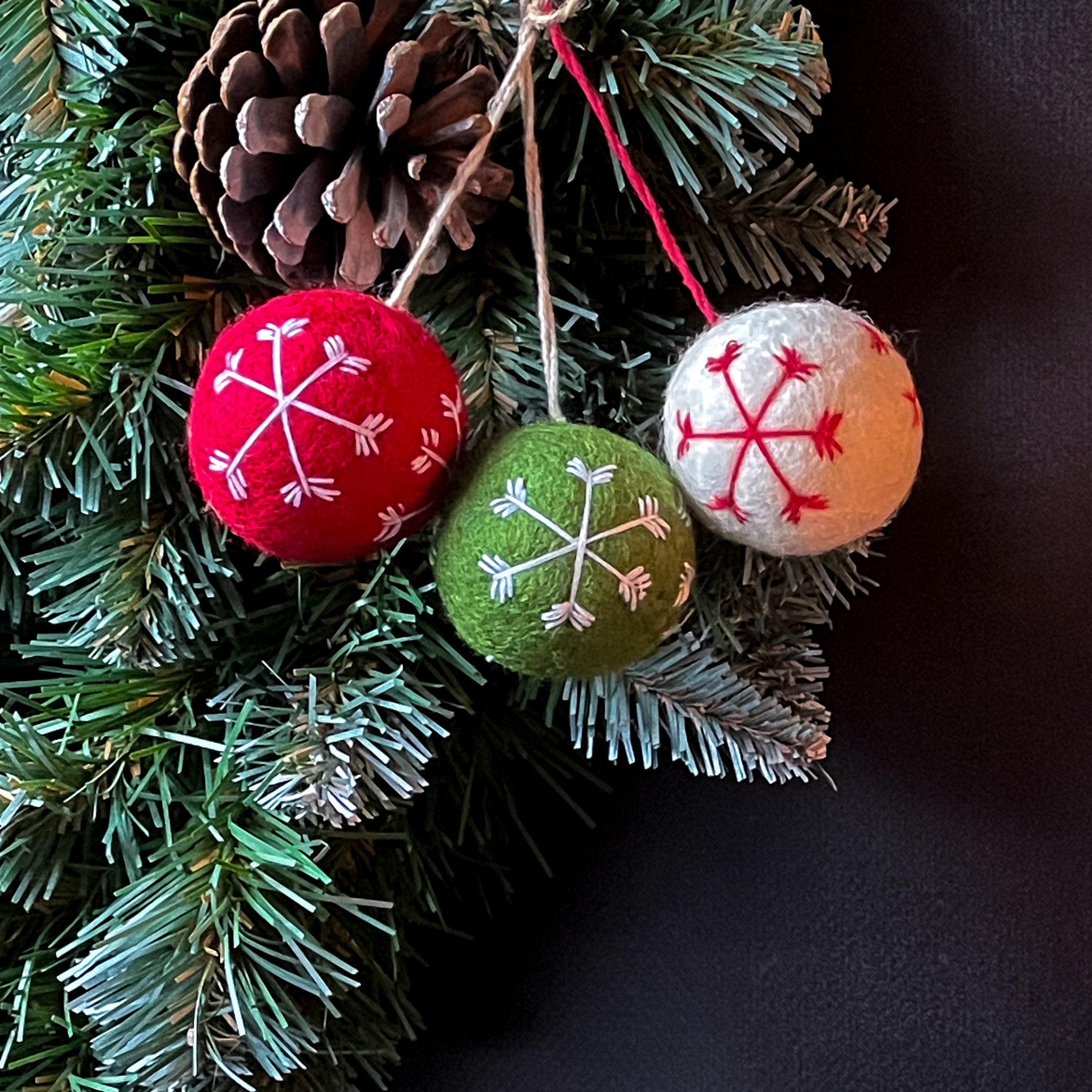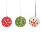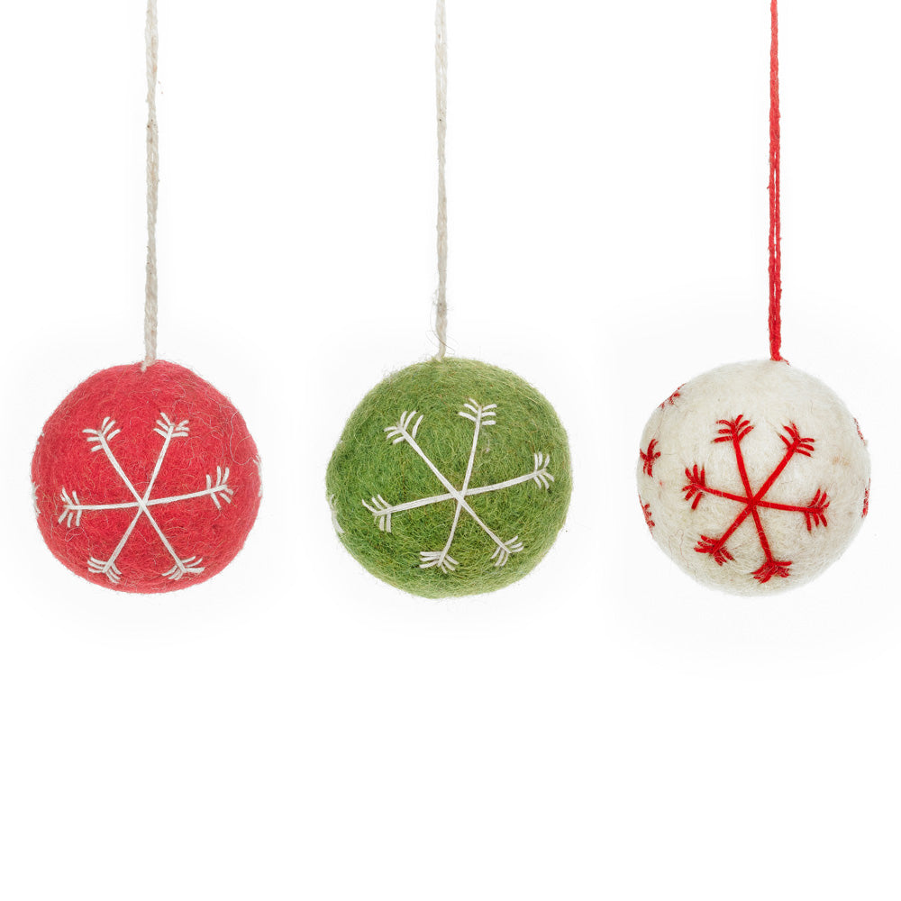 Celebrate the holiday season with this set of three festive Snowflake Baubles, each one handmade from wool. Each bauble is beautifully hand-stitched with a delicate snowflake design using organic cotton thread, and dyed with eco-friendly, azo-free dyes.
