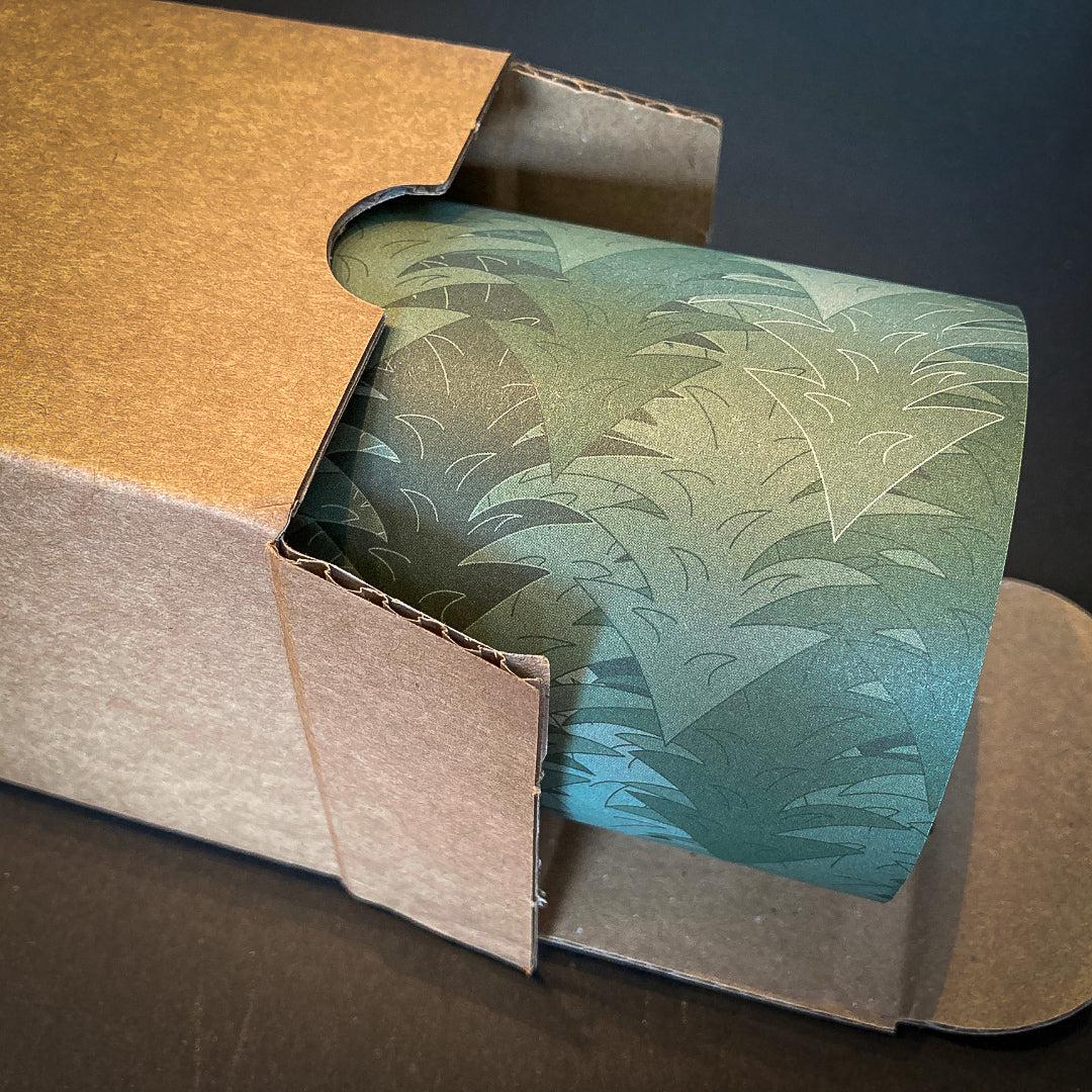 Het tissuepapier dat we gebruiken is gemaakt van 30% gerecycled materiaal, de rest van nieuwe zuurvrije pulp. Het is FSC-gecertificeerd. Het ontwerp is bedrukt met inkt op sojabasis die geen chemische resten achterlaat en veilig kan worden gerecycled. Er zijn geen logo's gebruikt in het ontwerp, alleen een mooi varenblad, dus je kunt het vloeipapier hergebruiken en een tweede leven geven.
