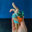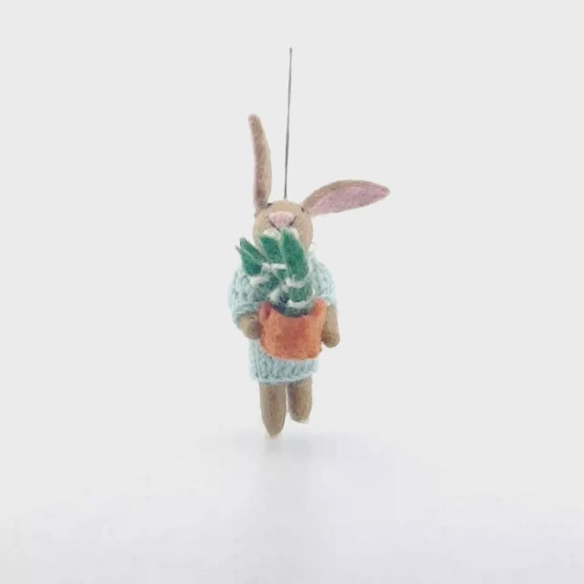 The details on Benjamin Bunny are incredible. He is made using traditional needle felting techniques, with hand embroidered detailing on his adorable face. He is dressed in a blue jumper, hand knitted by skilled artisans in Nepal, with a plant and pot stitched into his little paws for safe-keeping.